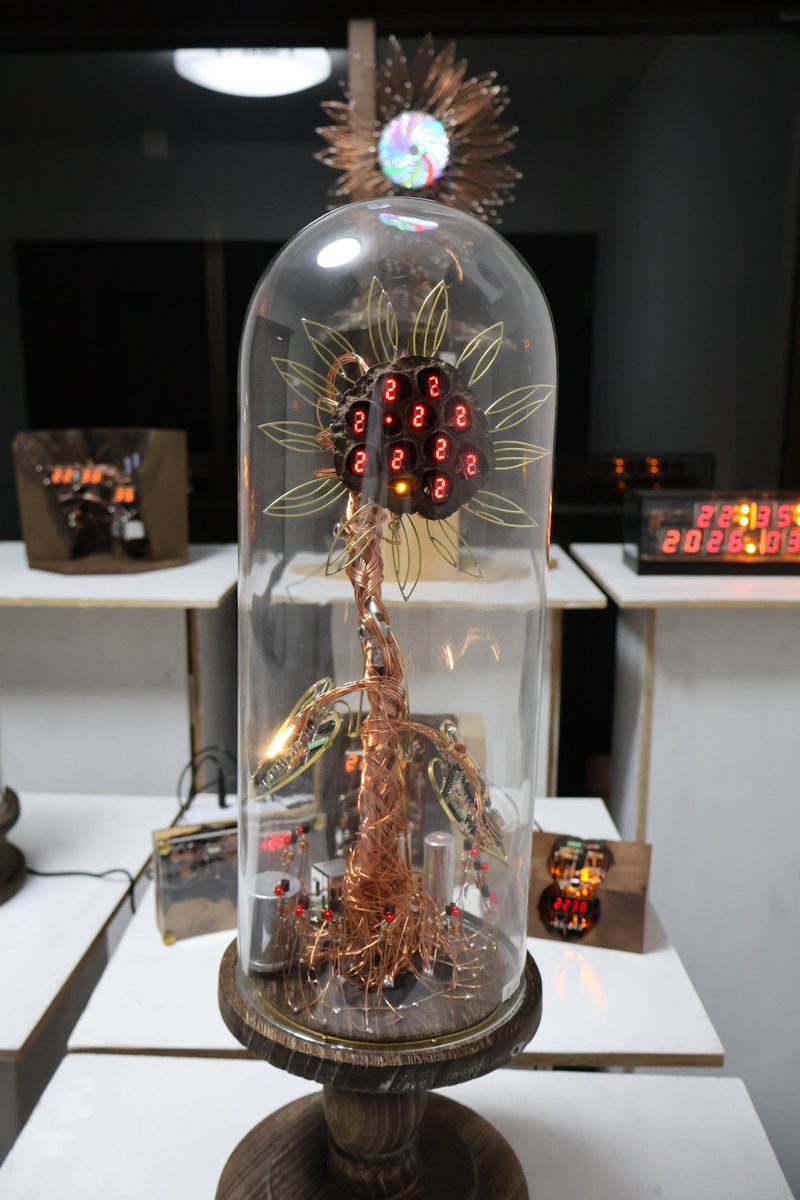 This clock seems to capture the low rumble heard in industrial zones at night. Copper wires stretched through the air resemble piping under intense heat. ICs and coils pulse silently, like the heart of a dormant furnace. Enjoy this “reactor core that burns time.” The clock is fully functional and can be set to the correct time.